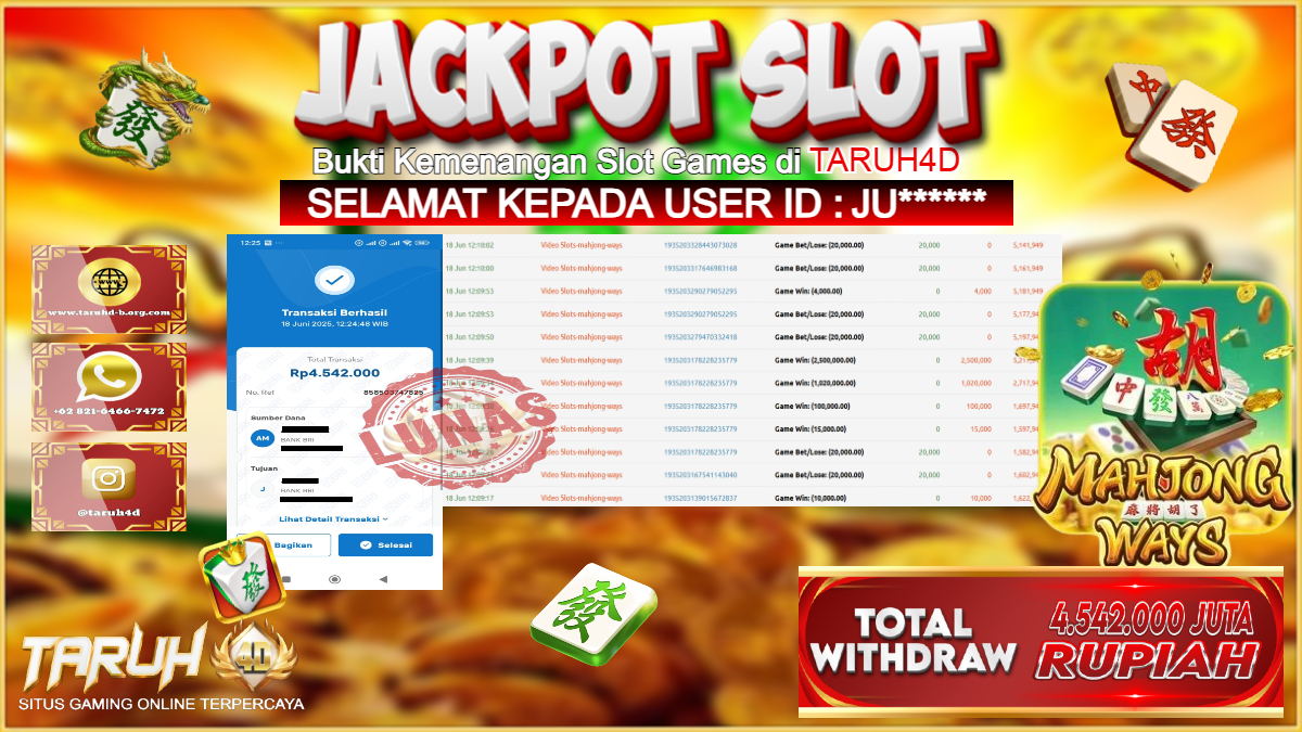 Selamat kepada User id : JU***** Telah berhasil mendapatkan kemenangan besar pada permainan slot MAHJONG WAYS  kemenangan Sebesar Rp.4.542.000, Setelah mengisi formulir withdraw dengan kurung waktu hanya 5 – 10 menit pihak taruh4d sudah melakukan transfer kepada pemilik Userid dan dana sudah dapat di cairkan oleh pemenang. Bukti pembayaran yang kami berikan merupakan bukti pembayaran yang SAH / VALID yang langung di dapatkan melalui tanda transfer transaksi dari Bank yang di tuju.
