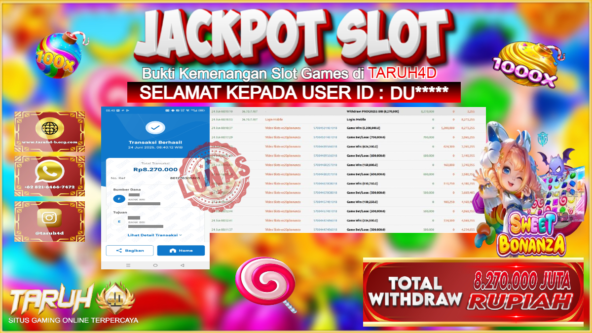 Selamat kepada User id : DU***** Telah berhasil mendapatkan kemenangan besar pada permainan slot SWEET BONANZA  kemenangan Sebesar Rp.8.270.000, Setelah mengisi formulir withdraw dengan kurung waktu hanya 5 – 10 menit pihak taruh4d sudah melakukan transfer kepada pemilik Userid dan dana sudah dapat di cairkan oleh pemenang. Bukti pembayaran yang kami berikan merupakan bukti pembayaran yang SAH / VALID yang langung di dapatkan melalui tanda transfer transaksi dari Bank yang di tuju.