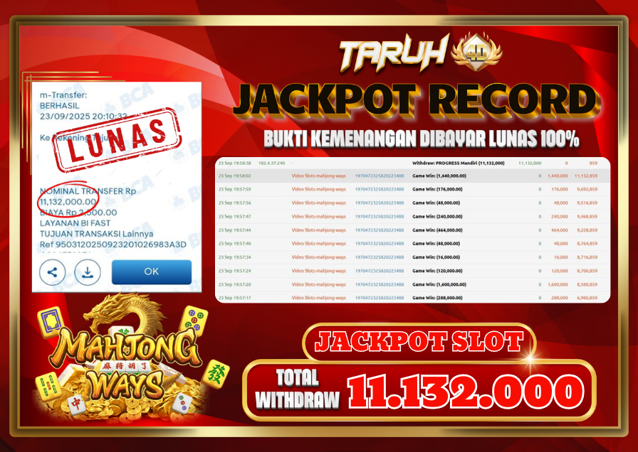 Selamat kepada User id : SI***** Telah berhasil mendapatkan kemenangan besar pada permainan slot MAHJONG WAYS kemenangan Sebesar Rp.11.132.000, Setelah mengisi formulir withdraw dengan kurung waktu hanya 5 – 10 menit pihak taruh4d sudah melakukan transfer kepada pemilik Userid dan dana sudah dapat di cairkan oleh pemenang. Bukti pembayaran yang kami berikan merupakan bukti pembayaran yang SAH / VALID yang langung di dapatkan melalui tanda transfer transaksi dari Bank yang di tuju.