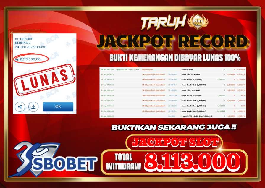 TARUH4D JACKPOT SPORTBOOK SBOBET Rp.8.113.000,- LUNAS!!!