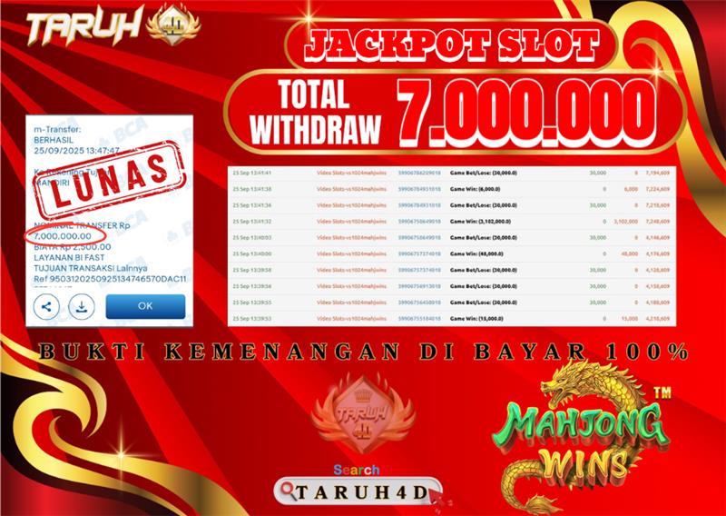 • TARUH4D JACKPOT SLOT MAHJONG WAYS  Rp.7.000.000,- LUNAS!!!