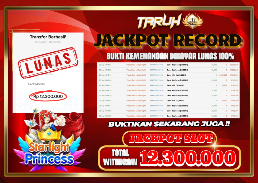 Selamat kepada User id : SI***** Telah berhasil mendapatkan kemenangan besar pada permainan slot STARLIGHT PRINCESS kemenangan Sebesar Rp.12.300.000, Setelah mengisi formulir withdraw dengan kurung waktu hanya 5 – 10 menit pihak taruh4d sudah melakukan transfer kepada pemilik Userid dan dana sudah dapat di cairkan oleh pemenang. Bukti pembayaran yang kami berikan merupakan bukti pembayaran yang SAH / VALID yang langung di dapatkan melalui tanda transfer transaksi dari Bank yang di tuju.