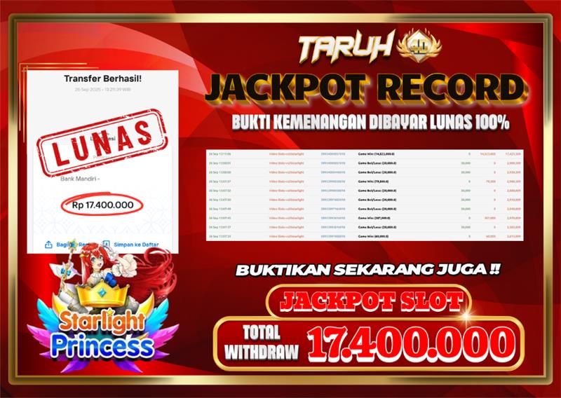 Selamat kepada User id : SI***** Telah berhasil mendapatkan kemenangan besar pada permainan slot STARLIGHT PRINCESS kemenangan Sebesar Rp.17.400.000, Setelah mengisi formulir withdraw dengan kurung waktu hanya 5 – 10 menit pihak taruh4d sudah melakukan transfer kepada pemilik Userid dan dana sudah dapat di cairkan oleh pemenang. Bukti pembayaran yang kami berikan merupakan bukti pembayaran yang SAH / VALID yang langung di dapatkan melalui tanda transfer transaksi dari Bank yang di tuju.