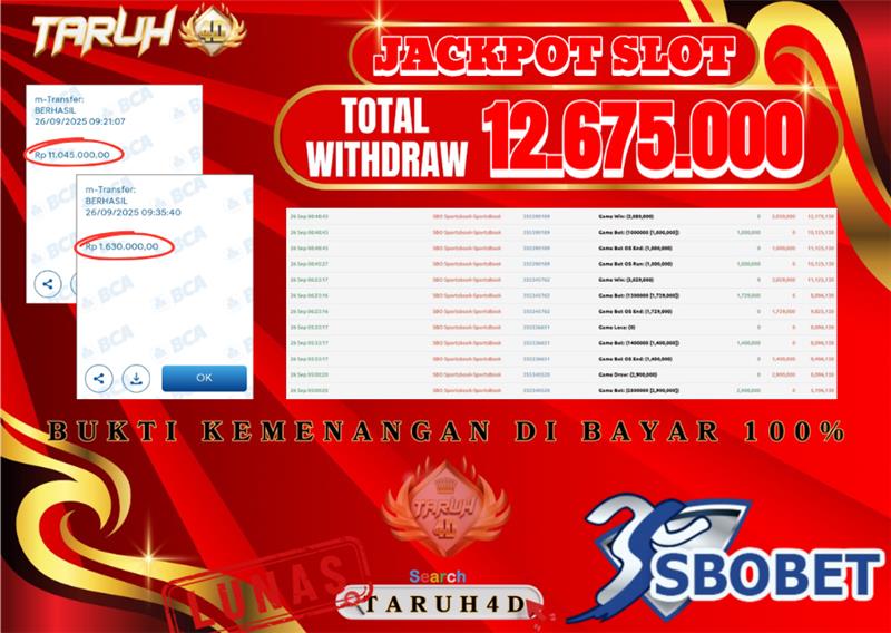 Selamat kepada User id : BE***** Telah berhasil mendapatkan kemenangan besar pada permainan sportbook SBOBET kemenangan Sebesar Rp.12.675.000, Setelah mengisi formulir withdraw dengan kurung waktu hanya 5 – 10 menit pihak taruh4d sudah melakukan transfer kepada pemilik Userid dan dana sudah dapat di cairkan oleh pemenang. Bukti pembayaran yang kami berikan merupakan bukti pembayaran yang SAH / VALID yang langung di dapatkan melalui tanda transfer transaksi dari Bank yang di tuju.