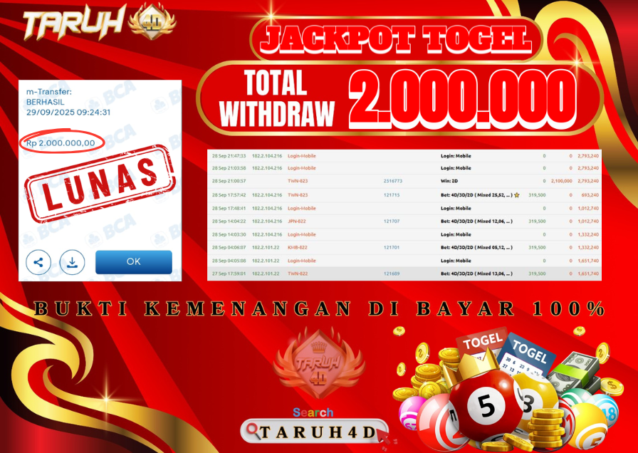 Selamat kepada User id : JO***** Telah berhasil mendapatkan kemenangan besar pada permainan TOGEL PASARAN TAIWAN kemenangan Sebesar Rp.2.000.000, Setelah mengisi formulir withdraw dengan kurung waktu hanya 5 – 10 menit pihak taruh4d sudah melakukan transfer kepada pemilik Userid dan dana sudah dapat di cairkan oleh pemenang. Bukti pembayaran yang kami berikan merupakan bukti pembayaran yang SAH / VALID yang langung di dapatkan melalui tanda transfer transaksi dari Bank yang di tuju.