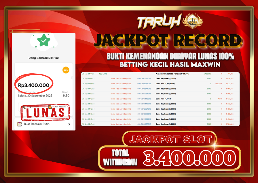 Selamat kepada User id : SI***** Telah berhasil mendapatkan kemenangan besar pada permainan slot STAR PIRATES CODE kemenangan Sebesar Rp.3.400.000, Setelah mengisi formulir withdraw dengan kurung waktu hanya 5 – 10 menit pihak taruh4d sudah melakukan transfer kepada pemilik Userid dan dana sudah dapat di cairkan oleh pemenang. Bukti pembayaran yang kami berikan merupakan bukti pembayaran yang SAH / VALID yang langung di dapatkan melalui tanda transfer transaksi dari Bank yang di tuju.